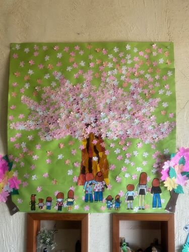 保育の岡田です この壁画は3年前に作ったもので大切にとってある作品のひとつです この3年でスタッフの子どもたちは(女の子は) 母と同じ道に進んだ子 高校生になった子 小学生になった子 と 3年前の幼かったうしろ姿が 今は成長したうしろ姿になってい…