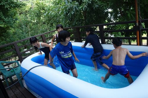 学校も夏休みに入り小学生組が保育に加わり賑やかになっています 助産院のウッドデッキにもプールを出し保育から帰って来た子供たちが早速遊び始めました 数センチしか溜まってない水の中で走り回っているお兄さん、お姉さんたち あまりの激しさにちびっこは…